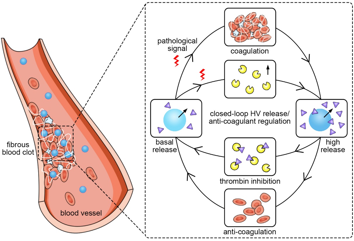 血栓是心腦血管疾病的重要誘因,凝血酶在血栓形成過程中發揮著重要作用。水蛭素是迄今為止發現的最強的天然凝血酶抑制劑。不同于肝素,天然/重組水蛭素通過與凝血酶發生特異性結合,形成穩定的復合物,抑制凝血酶的活性,發揮抗血栓作用。并且水蛭素對血小板作用弱,不會引發肝素誘導的血小板減少癥等不良反應。但作為肽/蛋白類生物藥物,水蛭素存在體內易被酶解,半衰期短,生物利用低等缺陷,并且臨床應用伴有出血風險。為此,課題組構建了“自調式”納米凝膠系統用于水蛭素的高效遞送。該納米凝膠提高了水蛭素的體內穩定性和生物利用度,并可“感受”體內凝血酶濃度的變化響應性釋放負載的水蛭素,形成“閉環式”釋藥行為,高效調控釋藥量,提高水蛭素的抗血栓作用,并降低出血等不良反應。該研究豐富了肽/蛋白類生物藥物的高效遞送技術,為血栓類疾病的治療提供了新策略。