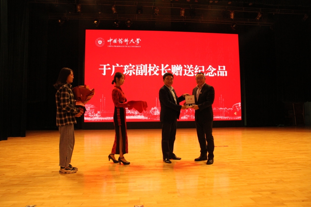 講座開(kāi)始前,于廣琮副校長(zhǎng)代表學(xué)校向李君寧博士贈(zèng)送了一套“學(xué)校80周年校慶定制校徽”和一套“醉美藥大”主題書(shū)簽并現(xiàn)場(chǎng)為他佩戴校徽。