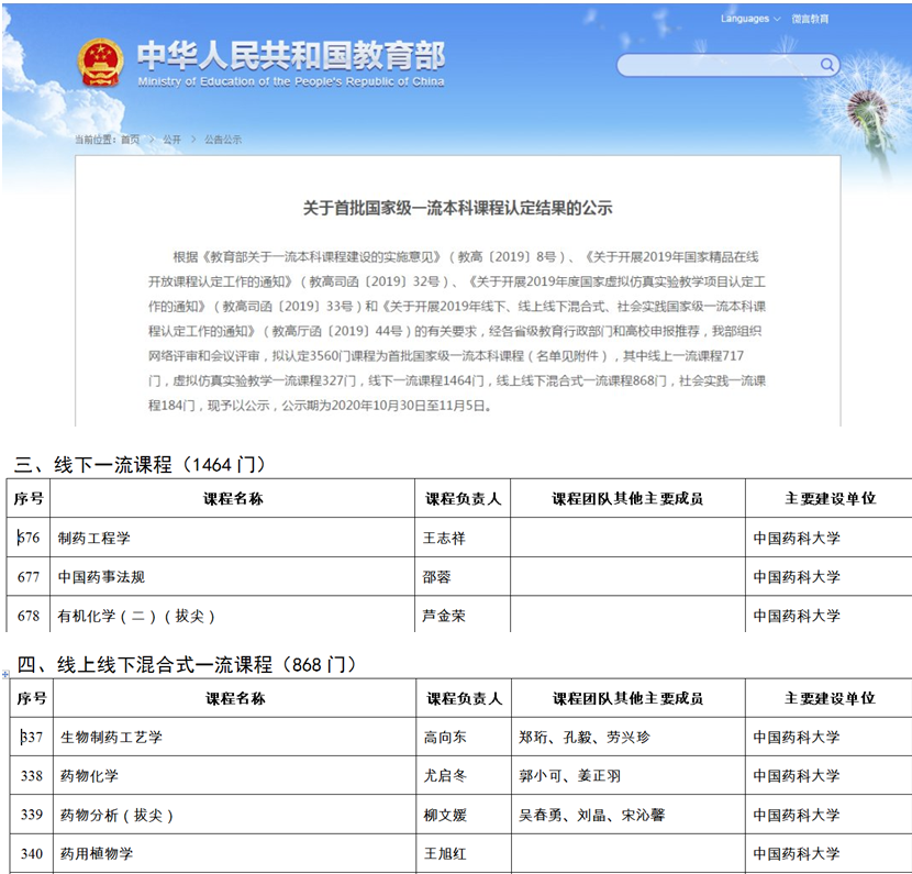 近日,教育部發布了《關于首批國家級一流本科課程認定結果的公示》,我校7門課程入選認定結果的公示名單,其中線下一流課程3門,線上線下混合式一流課程4門,入選課程總數位居全國藥學類院校首位。截至目前,學校國家級一流本科課程類型已涵蓋線上、線下、線上線下混合式、虛擬仿真實驗教學等4種類型,獲獎總量已達14門。