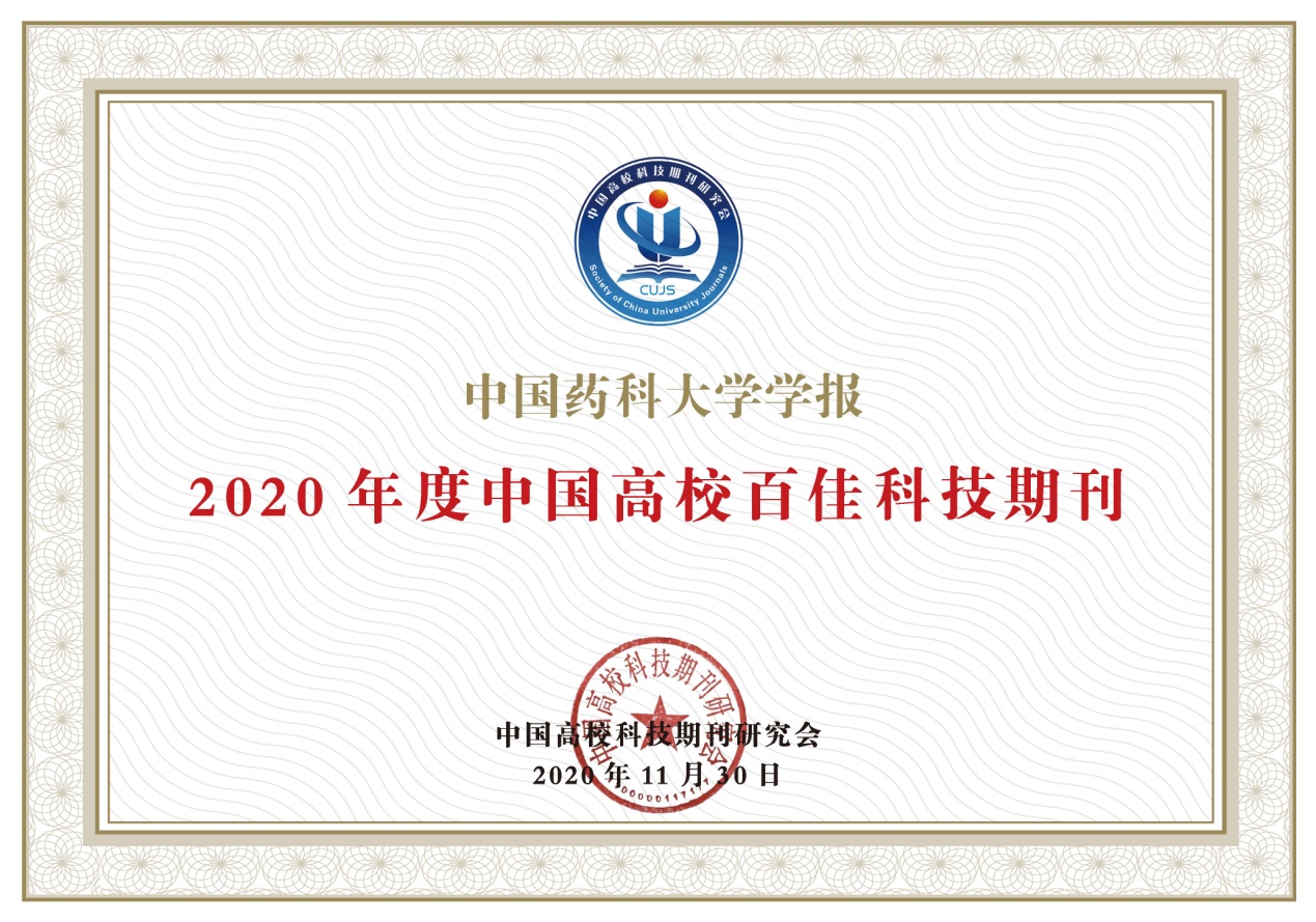 《中國藥科大學學報》獲此殊榮得益于編輯部一直以來對用稿質量和編輯出版質量的嚴格把關,也得益于編委會、審稿專家及作者的大力幫助。此次獲得的榮譽既是對《中國藥科大學學報》期刊質量的表彰和肯定,也對期刊提出了更高的要求。今后編輯部將依托中國藥科大學優勢學科,不斷提高《中國藥科大學學報》的創新力、引導力和影響力,更好地服務于中國藥科大學“雙一流”學科建設。
